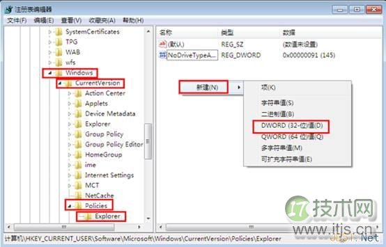 2.打开注册表编辑器,左边栏目中依次进入“HKEY_CURRENT_USE ” — “software” — “Microsoft” — “Windows” — “CurrentVersion” — “Po-licies” — “Explorer”,在右边栏目中右击,选择“新建” — “DWORD值”,如下图所示