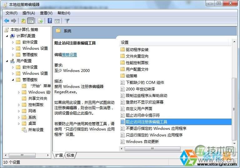 2、打开策略组编辑器后,在【用户配置】下点开【管理模板】然后点【系统】项,在右侧窗口中我们可以看到有一项“阻止访问注册表编辑工具”,双击该项,将“未配置”更改为“已启用”,然后点击应用,再按确定;如下图