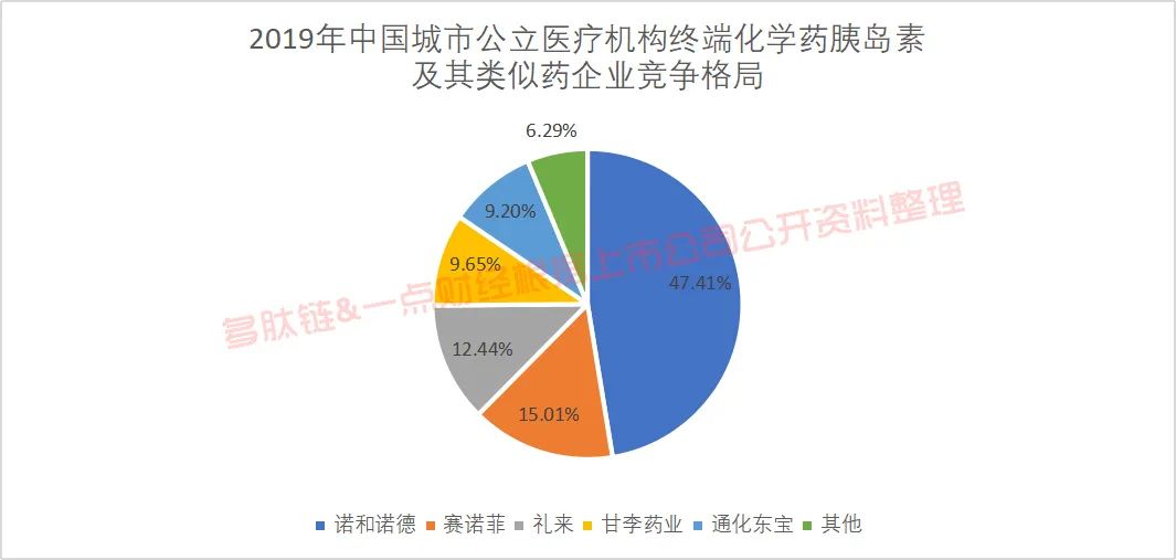 由此可看出,诺和诺德几乎是占据了胰岛素的“半壁江山”,而国内药企方面,甘李药业和通化东宝则是不分仲伯,均以近10%的市场份额领先于其他的国内企业。