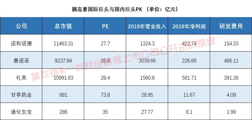 对比来看,国内的胰岛素巨头和全球胰岛素巨头之间的差距,无论是市值、PE、业绩和研发费用方面,都是有着不小差距。
