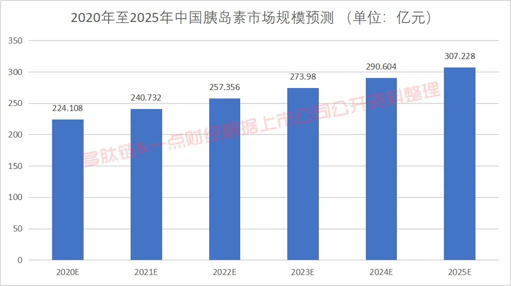 根据中国商业研究院的数据显示,2019年我国胰岛素市场规模约为200亿元人民币,并预测2025年中国胰岛素市场规模达307.23亿元。