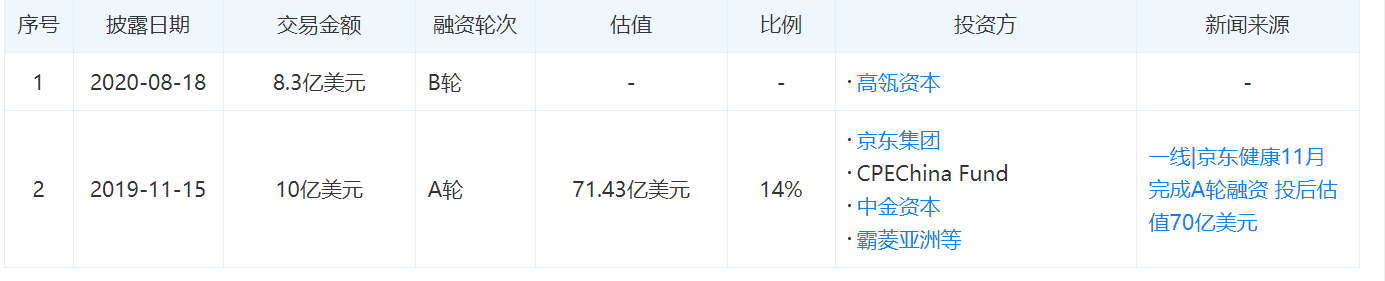 截至目前,该公司已经历两轮融资。京东健康于2019年获得超过10亿美元的A轮融资,投后估值约70亿美元;于今年8月又获高瓴资本的8.3亿美元B轮融资。据胡润研究院2020年8月发布的《胡润独角兽榜单》显示,京东健康是全球最年轻独角兽,估值从2019年11月A轮融资后的70亿美元,上涨至现在的300亿美元左右。