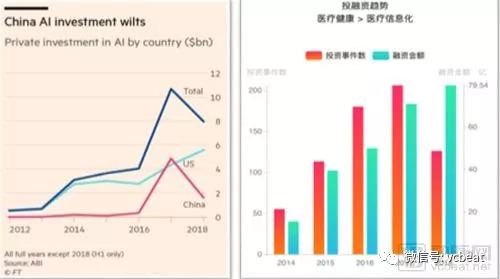 由下图数据可知,第一,根据2018年的投资情况,AI总的投资量在国内确实下降,但在美国却是上升的。