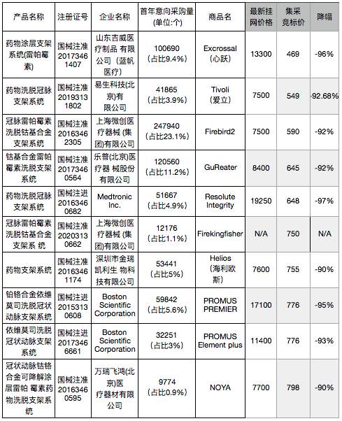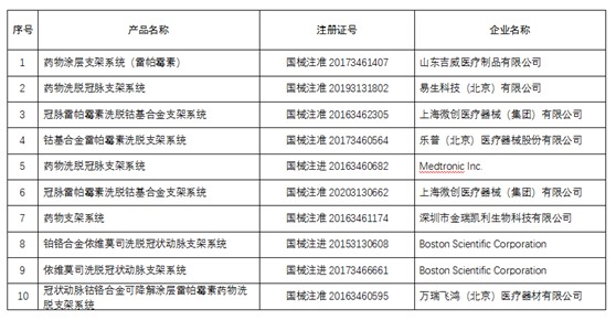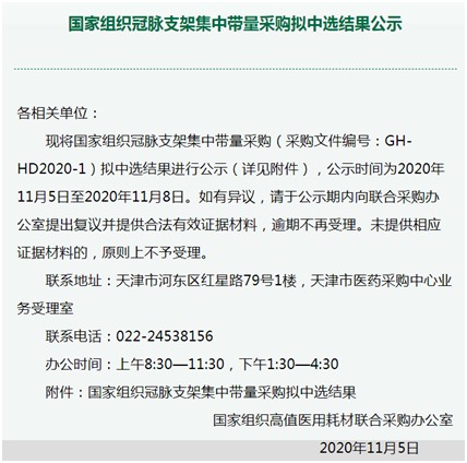 11月5日,备受瞩目的首次国家组织高值医用耗材集中带量采购在天津开标。天津市医药采购中心发布“国家组织冠脉支架集中带量采购拟中选结果公示”,本次集中带量采购的冠脉支架材质为钴铬合金或铂铬合金,载药种类为雷帕霉素及其衍生物,采购周期为两年,预计全国患者将于2021年1月用上国家集采降价后的中选产品。拟中选结果公示时间为2020年11月5日至2020年11月8日。其中8家企业的10个产品拟中标。