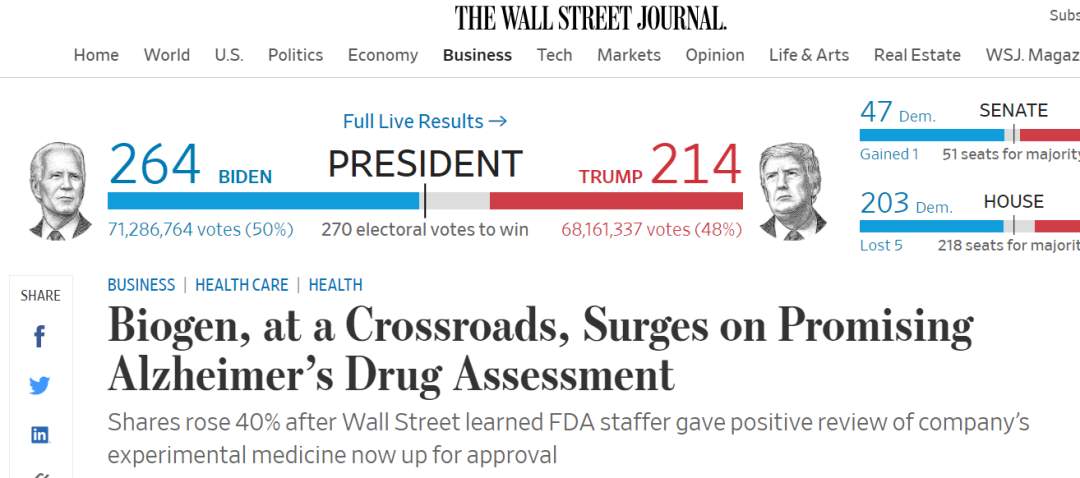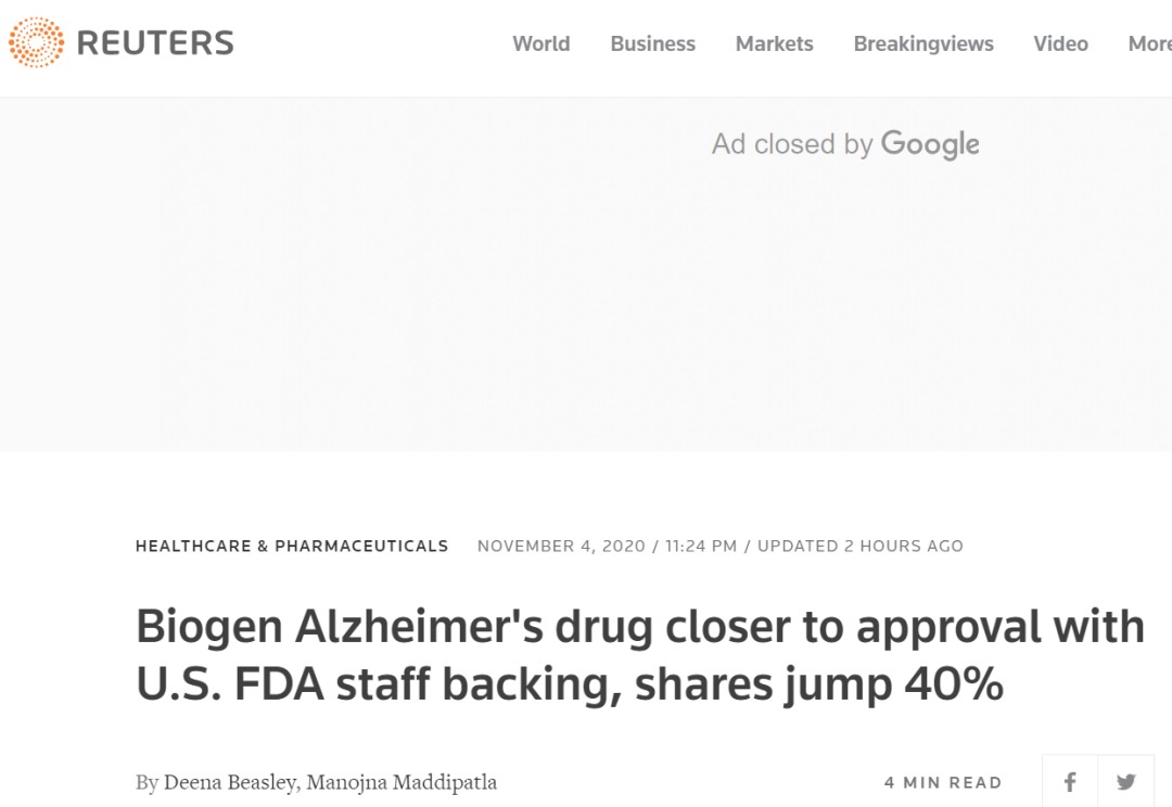 Biogen及其合作伙伴卫材股份有限公司(Eisai Co Ltd)的股价均上涨40%。FDA工作人员的评论也鼓舞了其他阿尔茨海默病药物开发商的股票,包括Eli Lily公司的股票上涨了15%。