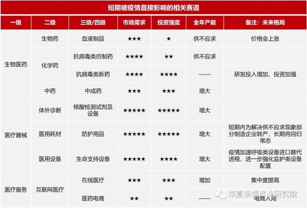 制药/制剂:绝大多数制药企业已于2月中下旬复工或分批复工。部分生产企业,以及含有与疫情相关的抗病毒、抗生素、中成药等生产条线的企业,产品一直面临供不应求的局面,复工复产节奏加快。体外诊断IVD:新冠、流感等呼吸道病原体检测和血液检测产品需求激增。为与新冠区分,症状类似的流感等呼吸道疾病的病原体检测,临床辅助诊断相关的血球、CRP、PCT等检测产品也出现短期需求激增。截至目前共批准新冠病毒核酸检测试剂厂家10家,抗体检测试剂4家。随着疫情的全球蔓延,16家IVD企业新冠检测试剂盒通过CE认证,需求激增下的增产或将持续全年。监护检测设备:受疫情持续发酵影响,医院对疫情相关的CT、MRI、DR、监护仪、呼吸机、麻醉机、彩超、除颤仪、灯床塔、血氧检测仪、额温枪等医疗设备需求明显增加。此外全国“小汤山”和方舱医院的建设拉动设备需求增加,复产增产贯穿整个一季度。医用耗材:医用口罩、医用防护服等疫情防护耗材几近脱销,相关医疗器械公司均紧密生产以满足供应,或新建相关生产线支持疫情。同时其他的医用卫生耗材、注射穿刺类、医用消毒和医技耗材类等相关企业均在激增的需求下复产增产。第三方医学诊断:ICL支持各地战疫,弥补现有医疗体系检验能力不足。全国各省市陆续发文允许和支持符合条件的第三方检测机构开展核酸检测,助力提升病毒感染确诊效率,为疫情防控提供保障。武汉华大基因和火眼实验室,每天可完成10万人份的试剂盒生产和检测,已经陆续向超过30个国家和地区发出。