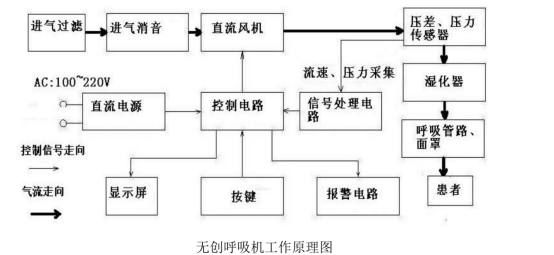 无创呼吸机通过采集机器里的压力传感器、流速传感器信号,建立呼吸的数学模型,设计出呼吸智能算法对呼吸阻力、顺应性、漏气、呼吸相位差异等方面进行补偿,达到良好的吸气和呼气同步触发。无创呼吸机工作模式通常为双水平正压通气(Dynamic double Positive Airway Pressure,DPAP)和持续气道内正压(Continuous Positive Airway Pressure,CPAP)等多种气道内正压通气模式。无创呼吸机由进气过滤、进气消音、直流风机、压力及压差传感器、湿化器、呼吸管路及面罩、直流电源、控制电路、信号放大电路、显示屏(彩色)、按键、报警电路等功能部件组成。工作原理如下图所示: