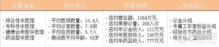 根据《中医药馆》期刊的普查调研,全国约有5.5万家中医类医馆,包含国医馆、中医馆和中医诊所三类,行业收入约170亿元。国医馆代表了医馆的较高水平,根据对全国578家国医馆运营情况的统计分析,国医馆的盈利模式仍以药品销售为主,国医馆平均医师数量10.4人,平均诊室数量7.5间,每年平均营业额1084万元/店,主要由诊金收入、医技收入、药品收入三部分构成。