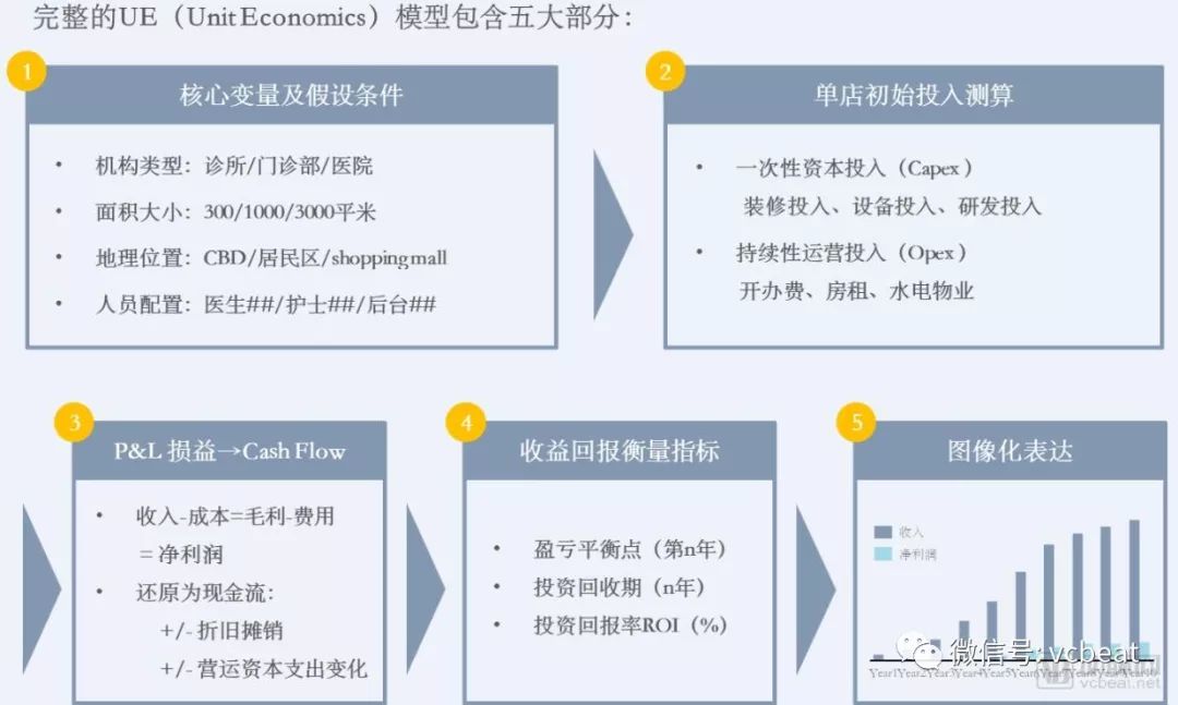 (1)单店经济性UE模型:单店经济UE模型用于分析什么样的单店形态最经济、效率最高?例如医疗机构应该建设300还是3,000平米,投放10把还是20把牙椅,投入1,000还是3,000万收益最佳?UE模型以单个门店为单位,以纵向时间轴为坐标,分析初始投入和最终产出的效益对比,以及分析单店经营营运过程中经营状况、财务损益和现金流变化情况。