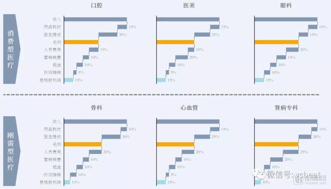 对于专科连锁影响损益最敏感的指标有三个:医生提成、营销费用和租金费用。在不同专科领域可以看到基于对医生的依赖程度、获客成本和租金成本明显的差异。例如在消费型医疗连锁典型医美行业,因为获客成本因而体现在营销费用占比较高。