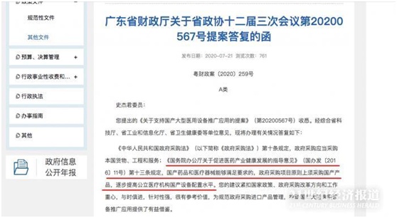 近日,广东省财政厅在其官网发布了《关于省政协十二届三次会议第20200567号提案答复的函》(下称《答复函》),其中就政协委员提出“规范政府采购进口产品管理,推动国产大型医用设备推广应用”做出明确答复:积极鼓励公立医疗器械使用单位优先配置国产自主品牌乙类大型医用设备,逐步提高国产医用设备配置水平。