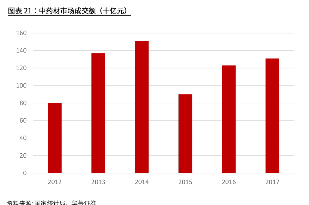 目前中药材行业的特点主要包括:药材质量和价格对中下游影响巨大作为中药产业链的上游行业,中药材质量参差不齐,中药材原料流通环节过多,药材难以溯源,各地的种植不规范、重金属污染残留、药效不稳定等顽疾依旧部分存在等问题严重影响了中下游的发展。此外,中药材的价格波动也往往对中下游生产产生较大影响。从国家统计局数据来看,2017 年中药材的市场成交额大概在1310亿元左右。