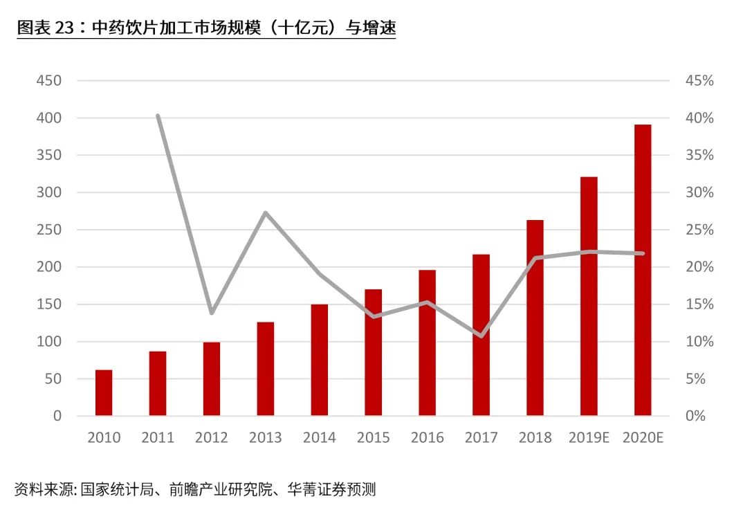 2013 年至2018年,中药饮片的营业收入从854亿元人民币增至2630亿元人民币,五年复合年增长率为25.2%。预计2020年中药饮片市场规模将达到3912亿元人民币。但由于行业进入壁垒较低,竞争格局小、雾散且混乱。前五大公司的市场份额集中度一直低于5%。