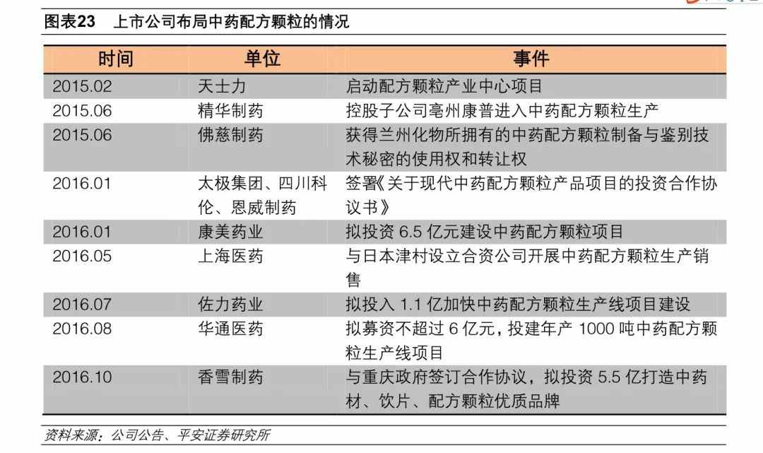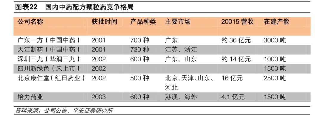 现有龙头、拥有地方资源、中药全产业链布局的公司具有竞争优势。之前由于国家政策限制,国内参与中药配方颗粒经营试点的企业一共只有 6 家,获批时间都在十年以上,在长期的生产经营中积累了丰富的产业、市场资源,具有一定的先収优势。而从部分地区医保政策来看,明显偏向本地区企业。国家此次拟对配方颗粒的放开是建立在对质量的严格把控下有条件的放开,包括可追溯的原料体系、完善的饮片炮制生产线。满足这些条件的企业才有资格备案生产,拥有中药材资源、在中药全产业链布局的公司更具竞争优势。