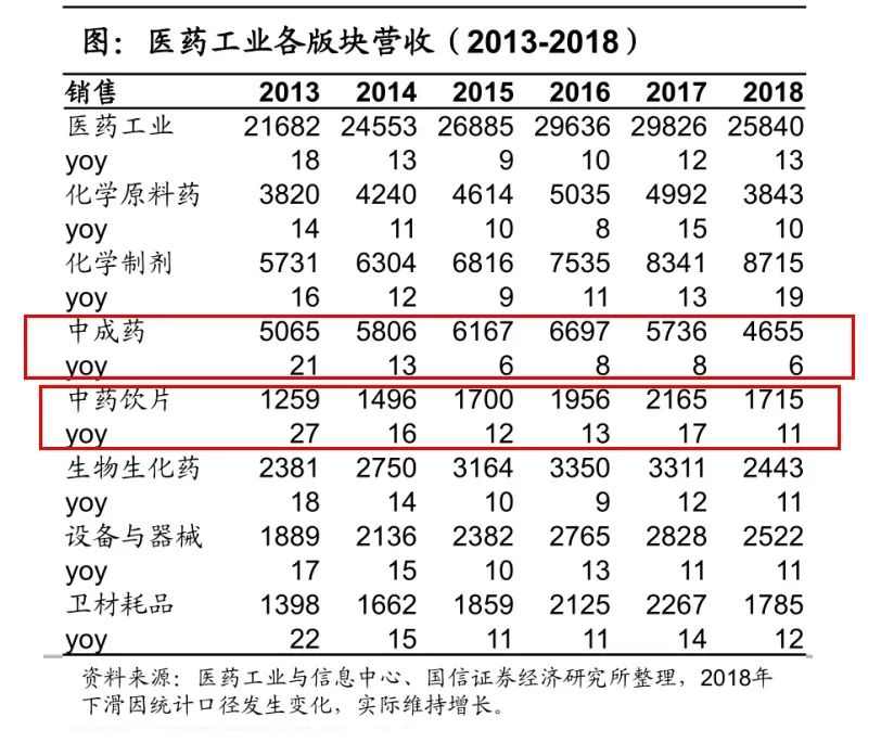 中成药整体营收增长不断下滑,只有个位数;中药饮片虽然增速较高,但是呈现不断下滑趋势。