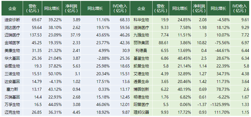 国内IVD领域上市公司最多在IVD试剂领域,而在海外,IVD检测试剂行业在发达国家市场格局较稳定,即以诊断四巨头罗氏(RHHBF.US)、雅培(ABT.US)、西门子(SMAWF.US)、丹纳赫(DHR.US)为主导。在国内,除了第三方独立实验室有外资禁入的要求,四巨头在其他很多诊断医学细分领域长时间占有大部分市场份额。国内企业IVD营收级别最高为几十亿元左右,多数企业收入IVD规模在一亿左右至十几亿不等。总体市场也较分散,这说明无论是何种规模的企业都能具有高成长空间。