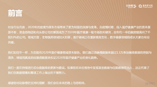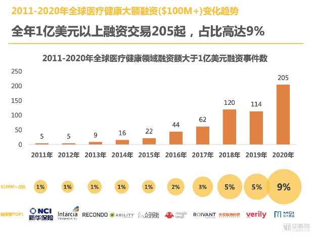 一.2020年全球医疗健康融资总额创历史新高,同比增长41%;全年1亿美元以上融资交易205起,占比高达9% 二.2020年中国医疗健康融资总额创历史新高,同比增长58%