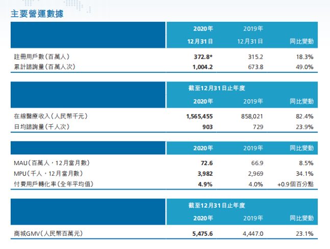 2020年,受益于互联网医疗对线下传统医疗服务的渗透速度加快,公司主要运营数据均有所拔高。