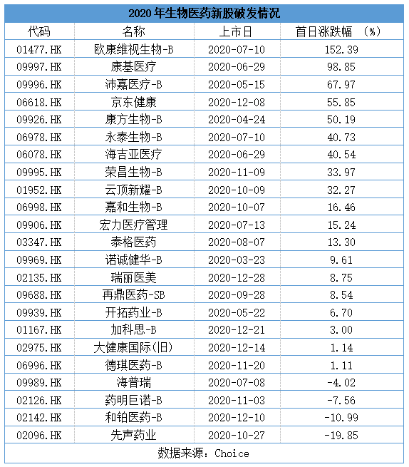 从总体上来看,2020年医药及医疗板块的新股上市表现良好。
