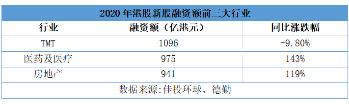 从新股的行业分布来看,2020年港股新股融资额前三甲分别为TMT、医药及医疗、房地产。