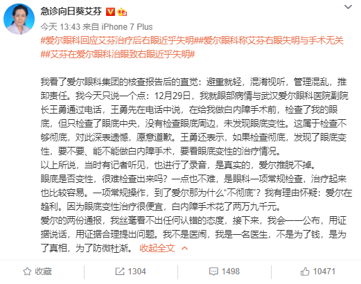 2020年12月31日,武汉市中心医院急诊科主任艾芬医生在微博上公开维权,表示自己的右眼几近失明的原因,是武汉爱尔医院的不恰当诊疗。