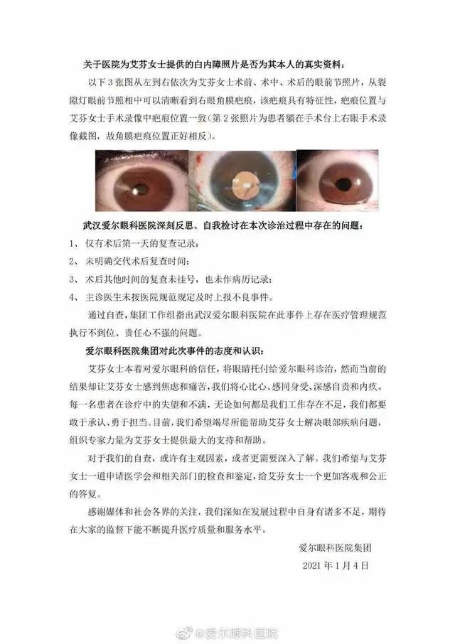 2021年1月2日,爱尔眼科医院官方微博消息,对于艾芬在武汉爱尔眼科医院的眼病诊治事件,爱尔眼科医院集团迅即成立集团调查工作组,并于2021年1月1日连夜赶赴武汉进行调查。工作组将对此事进行全面调查核实。