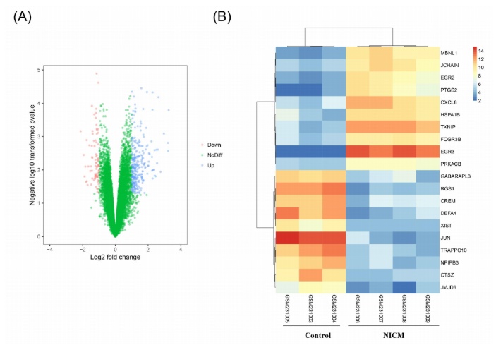 图1A.健康样本与NICM样本的DEG;图1B.Top5上调和下调DEG在不同样本中的表达情况