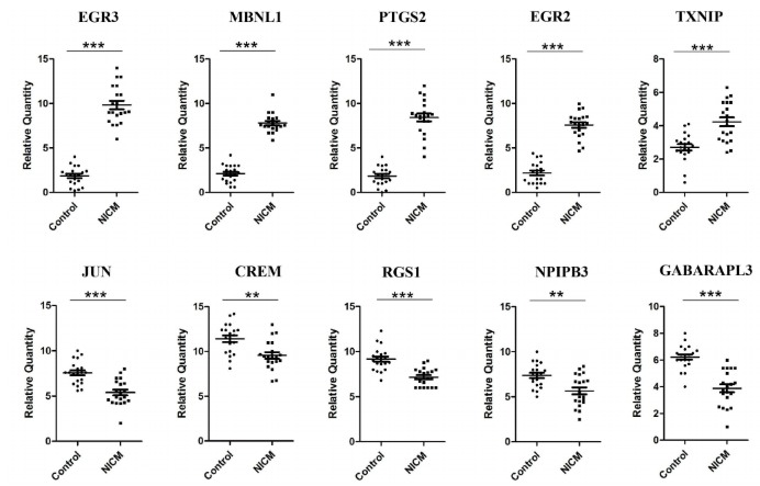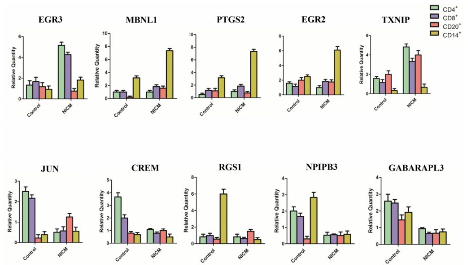 此外,作者还检测了PBMC亚型中Top5上调基因和Top5下调基因的mRNA水平。目前已知PBMC主要包括T细胞、B细胞和单核细胞。因此,作者主要探讨了这10个基因在CD4+T细胞、CD8+T细胞、CD14+单核细胞和CD20+B细胞中的mRNA水平(图5)。发现EGR3主要在NICM小鼠T细胞中表达。单核细胞中MBNL、PTGS2和EGR2均较高,而NICM小鼠的表达明显较高。TXNIP主要表达于CD4+T细胞,CD8+T细胞和CD20+B细胞,在NICM存在下其表达显著增加。关于下调基因,作者发现JUN在正常受试者的T细胞中高表达,而在NICM小鼠的T细胞中其水平降低,但在B细胞中增加。CREM主要在T细胞中表达,而NICM小鼠T细胞中CREM水平降低。RGS1主要在正常小鼠的B细胞中表达。与NICM小鼠相比,正常小鼠T细胞和单核细胞NPIPB3水平较高。四种免疫细胞中GABARAPL3的mRNA水平在正常小鼠中始终高于NICM小鼠。