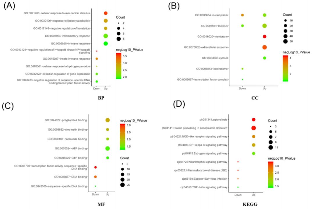 为深入了解上述DEG,作者使用DAVID数据库及配套工具进行了GO富集分析,发现在生物过程层面,上调的DEG主要富集于炎症反应、免疫反应、脂多糖反应、细胞对机械刺激的反应和翻译过程的负向调控,而下调的DEG则富集于基因表达的昼夜调节、序列特异性DNA结合转录因子活性的负调控、天然免疫反应、细胞对过氧化氢的反应和I-κB激酶/NF-κB信号的负调控。对于细胞组成来说,上调的DEG主要富集在胞外外泌体,细胞核,膜以及核质和胞浆中,而下调的DEG则富集在细胞核,核质,中心体和转录因子复合物中。在分子功能层面,上调的DEG主要负责ATP结合、poly(A)RNA结合、染色质结合、核苷酸结合和GTP结合,而下调的DEG可能在蛋白质结合、线粒体解偶联和细胞因子活性方面发挥作用。
