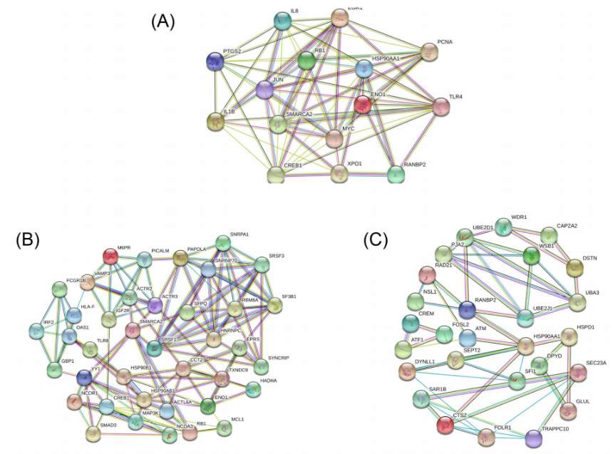 图3A.通过Cytoscape软件进行的PPI分析结果(图示15个枢纽基因);图3B,C.PPI网络中的两个评分最高的功能模块