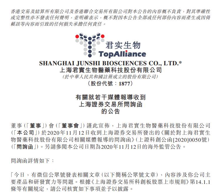 11月12日,有自媒体发布文章,《江湖就是人情世故》,文章称,君实生物的研发团队是一个大专生多过博士,一大半都是本科毕业的团队,而领导这支团队和这家公司的,是一对没有任何生物学科背景的父子。