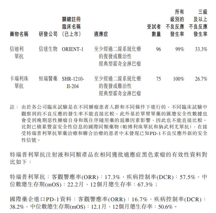 在11月13日发布的澄清公告中,君实生物列出了拓益和同类产品在获批适应症(均为有条件批准)的安全性资料对比。