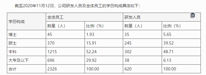 君实生物称,截至2020年11月12日,公司研发人员拥有本科及硕士学历的研发人员占研发人员总数量的88.23%,他们扎根于公司实验室、临床开发、质量管理等重要研发部门,构成了研发团队的中坚力量。博士学历的研发人员主要担任公司各研发团队的核心骨干,是公司各项研发工作中的领军人才,发挥着重要的引领作用。